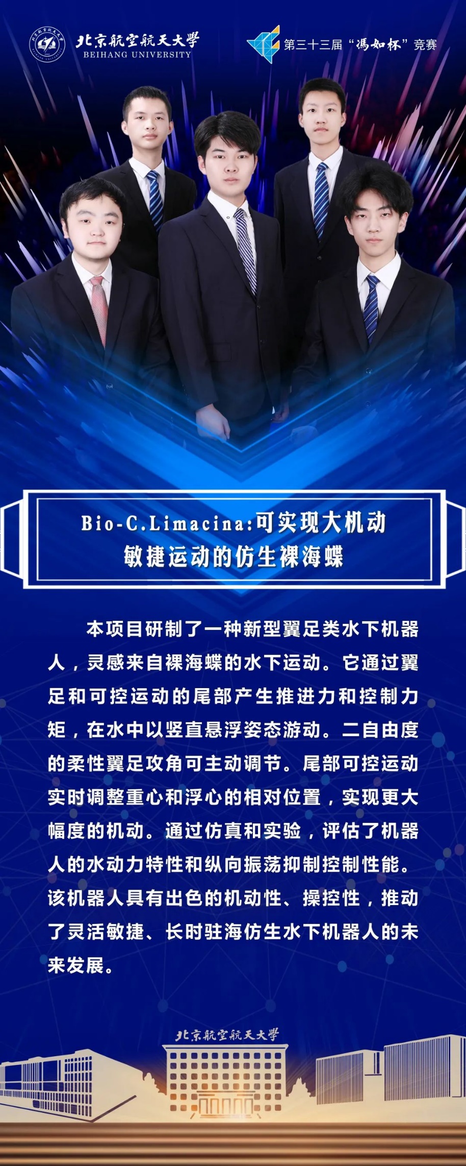 项目简介:本项目研制了一种仿裸海蝶的新型翼足水下机器人。创新设计了翼足和尾部结构,协同控制产生推进力实现水中竖直悬浮游动;主动调节柔性翼足攻角和实时调整尾部运动改变重心和浮心相对位置,实现大机动旋转。仿真和实验证明该机器人具有出色的敏捷机动特性和抗干扰能力,为设计长时驻海、灵活机动仿生水下机器人提供了新思路。