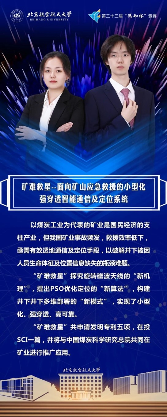 项目简介:以煤炭工业为代表的矿业是国民经济的支柱产业,但我国矿业事故频发,救援效率低下,亟需有效透地通信及定位手段,以破解井下被困人员生命体征及位置信息缺失的瓶颈难题。"矿难救星"探究旋转磁波天线的"新机理",提出PSO优化定位的"新算法",构建井下井下多维部署的"新模式",实现了小型化、强穿透、高可靠。"矿难救星"共申请发明专利3项,获33届冯如杯主赛道制作组一等奖,与煤炭科学研究总院达成合作意向。