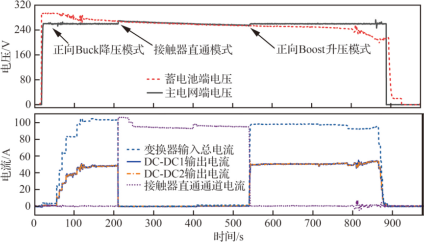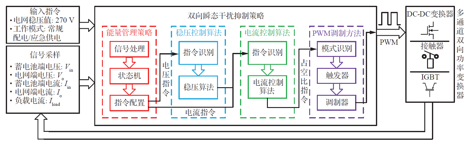 本文提出了一种基于电网电压-负载电流和蓄电池荷电状态的综合能量管理策略,采用基于微分跟踪方法的多模式状态机实现系统负载扰动的快速检测和供电模式的快速配置。通过仿真验证了状态转移逻辑的准确性,以及所提出脉冲补偿、能量回馈吸收、储能容量调节和应急泄放功能的有效性。本文还引入了微分跟踪器与负载电流前馈相结合的稳压控制算法,显著提高了系统在全负载范围内的动态响应速度和稳压精度。