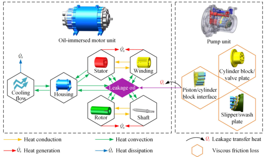 针对这一技术瓶颈,文章构建了油浸式电机-泵组件的闭环迭代动态热传递与累积热效应耦合模型。针对油浸式电机-泵组件在持续运行过程中面临的热退化风险,提出了一种考虑累积热效应的动态热耦合建模方法;基于该热建模方法,提出了油浸式电机-泵的闭环迭代动态热耦合建模框架;将泵内泄漏油作为电机-泵之间的热耦合介质,构建了机械-液压动态热交互模型,全面揭示机-电-液多物理场的动态热交互规律。