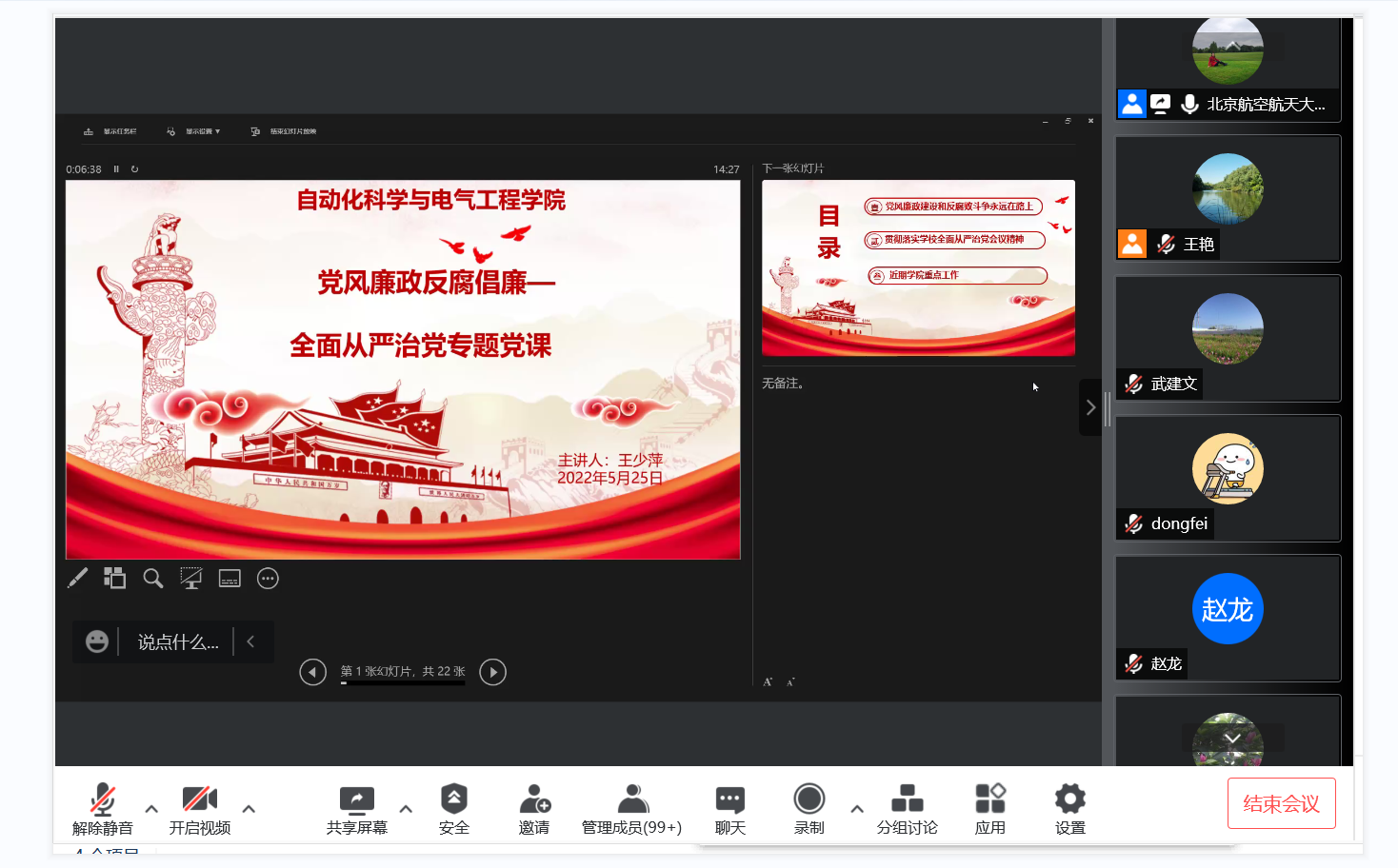 2022525日威廉希尔williamhill官网党委书记王少萍做了“从严治党党风廉政建设”专题党课。会议以线上腾讯视频会议方式进行,学院全体教职工参加了本次集体学习活动。