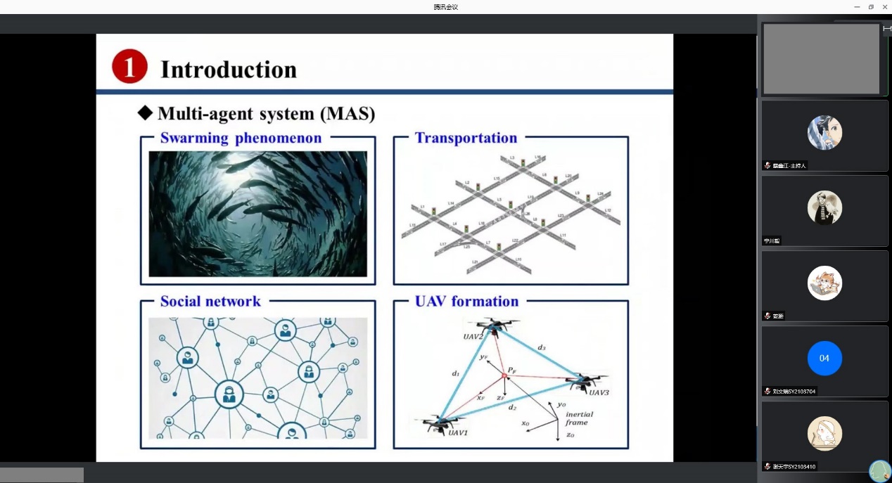 接下来进行分享的是威廉希尔williamhill官网2018级博士生张璟尧同学。他以“非线性多智能体网络系统在切换拓扑下的分布式迭代学习控制”为题,整合其发表在AUTOMATICA和IEEE TAC上的两篇论文研究内容进行汇报。张璟尧同学首先简要介绍了迭代学习控制的基本原理与优缺点,并以行进乐队为例,对迭代学习控制的对象——多智能体系统的相关特点与控制目标进行了阐述。随后引入代数图论、联合生成树等知识,设计分布式迭代学习控制协议,将全局Lipschitz条件放松为局部Lipschitz条件,通过理论推导、数值仿真等手段,回答了在具有切换拓扑的非线性多智能体网络系统中如何实现分布式迭代学习控制这一问题。