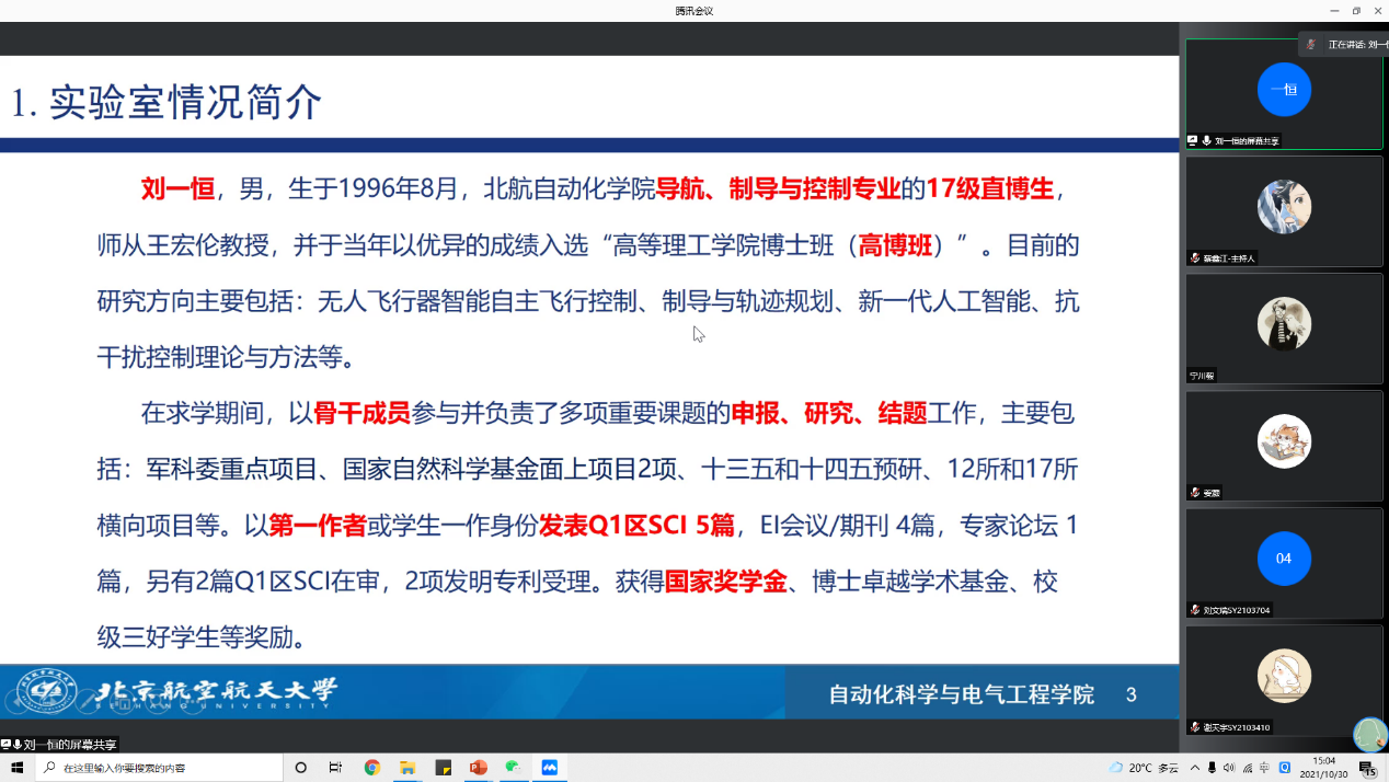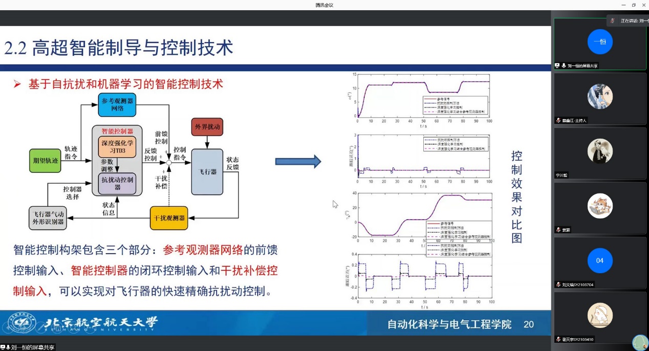 刘一恒同学是威廉希尔williamhill官网2017级博士研究生,师从王宏伦教授。汇报开始,刘一恒同学简要介绍了个人信息与课题组概况,随后围绕“无人机软式空中对接与回收抗扰动快速精准控制技术研究”,从“无人机空中对接与回收控制”、“高超智能制导与控制技术”、“无人机自主空中加油对接控制技术”、“飞行器空中态势感知与自主避撞技术”、“运载火箭上面级智能在线重规划技术”五个方面展开介绍,明确阐述了研究工作的重要性与难点,并通过大量图表、仿真结果、实验结果,直观地展示了其在博士期间丰富的科研成果。最后,刘一恒同学分享了自己在多年科研生活中总结出的宝贵经验,强调了明确研究方向、提前做好未来发展规划的重要性,分析了项目与科研的互补作用,也叮嘱大家要注意身体、健康生活。